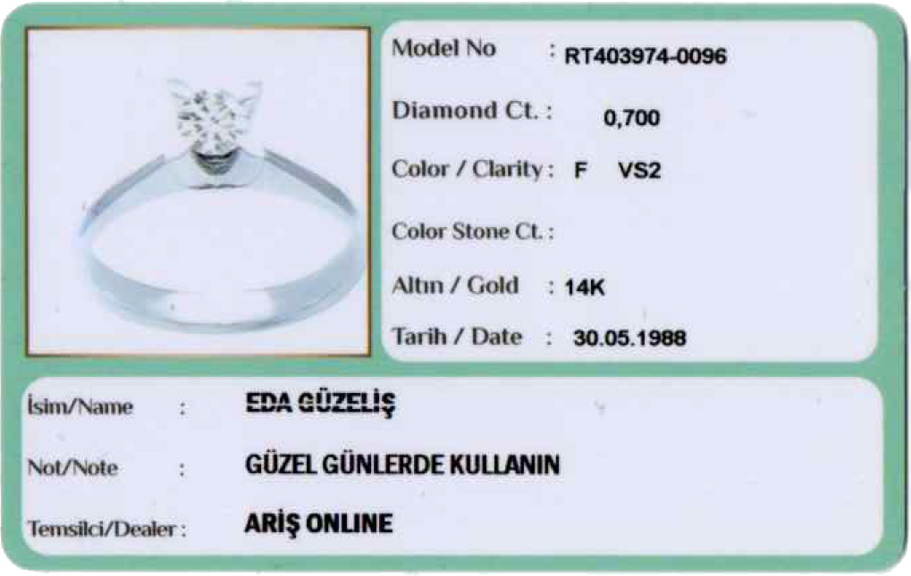 Pırlantası olmayan altın ürünlerde ve pırlantalı gümüş takılarda sertifika verilmemektedir. Ariş Pırlanta sertifikası sadece pırlantalı altın ürünlerde verilmektedir.